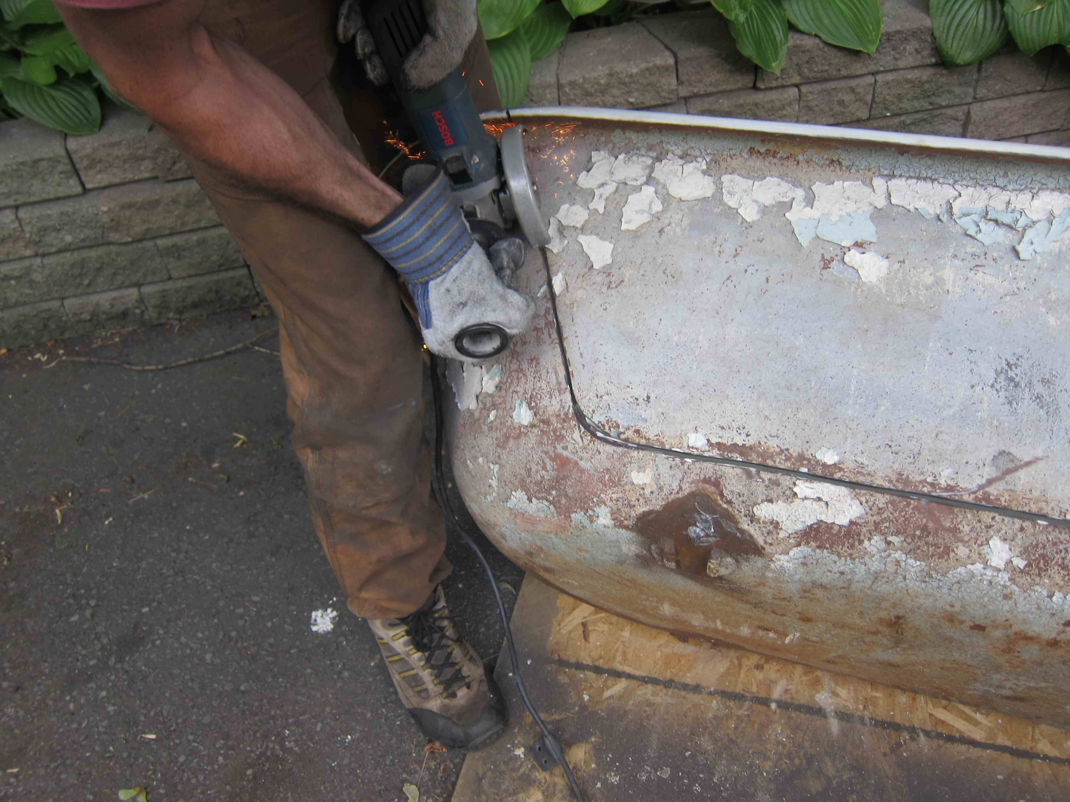 Step 2: Cut out with an angle 4 1/2 inch angle grinder. This puts enormous strain on the grinder, so work slowly and carefully. Wear gloves, protective clothing, goggles and a face mask.