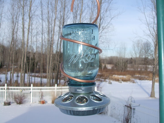 You can spread a little Mason Jar love to our feathered friends with this handmade Mason Jar Birdfeeder with copper hanging. Just fill the aqua blue glass vintage mason jar with seed and screw on the bottom. Holes allow for drainage and its easy to see when you need a refill! Sue Freeman is the bird-friend behind this pretty addition to your garden. Check out here Etsy store and place your orders here.