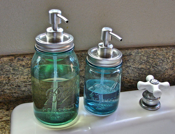 We love these soap dispensers from Glass Act Supply. Order the lids to fit any size Mason Jar for dispensing soap and lotion. If you want to put the lid on a smaller Mason Jar, just trim the plastic pipe down. You can decorate your own jars or place pebbles and seashells in the soap for added effect. You can order your dispenser lids from Glass Act Supply here.