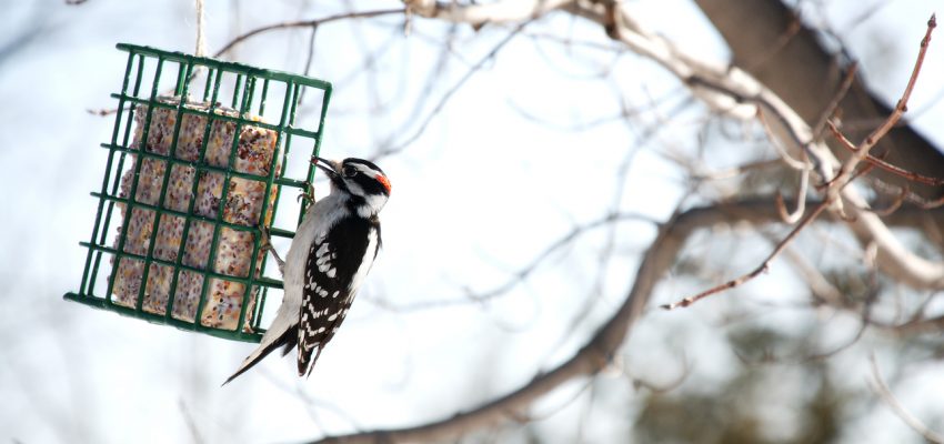 Is your backyard sparse of trees? You can get a bird feeder with a tail prop! With one of these, a woodpecker leaning its tail feathers on it can support itself while perched. Woodpeckers usually feed in a vertical position, so a bird feeder that can accommodate their natural feeding stance comes highly recommended.