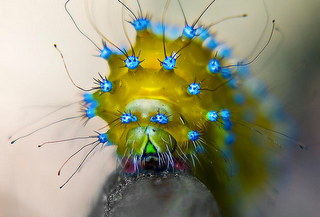 This radiant creature is the Saturnia Pyri Caterpillar which calls southern France and Italy home and grows up to be the Giant Peacock Moth.