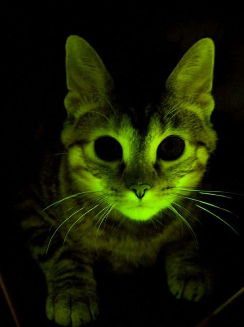 Here kitty! The next time your cat goes outside at night, you don’t have to spend hours trying to find them. Of course this didn’t just happen; it was a byproduct of genetic engineering. The New Scientist explains: “Scientists inserted the jellyfish gene for GFP along with the gene for HIV resistance into a cat egg before it underwent IVF treatment. The offspring and their descendants glow under blue light, showing that both genes were successfully bred into the line of cats and that the properties of the HIV resistance gene can be tested.”
