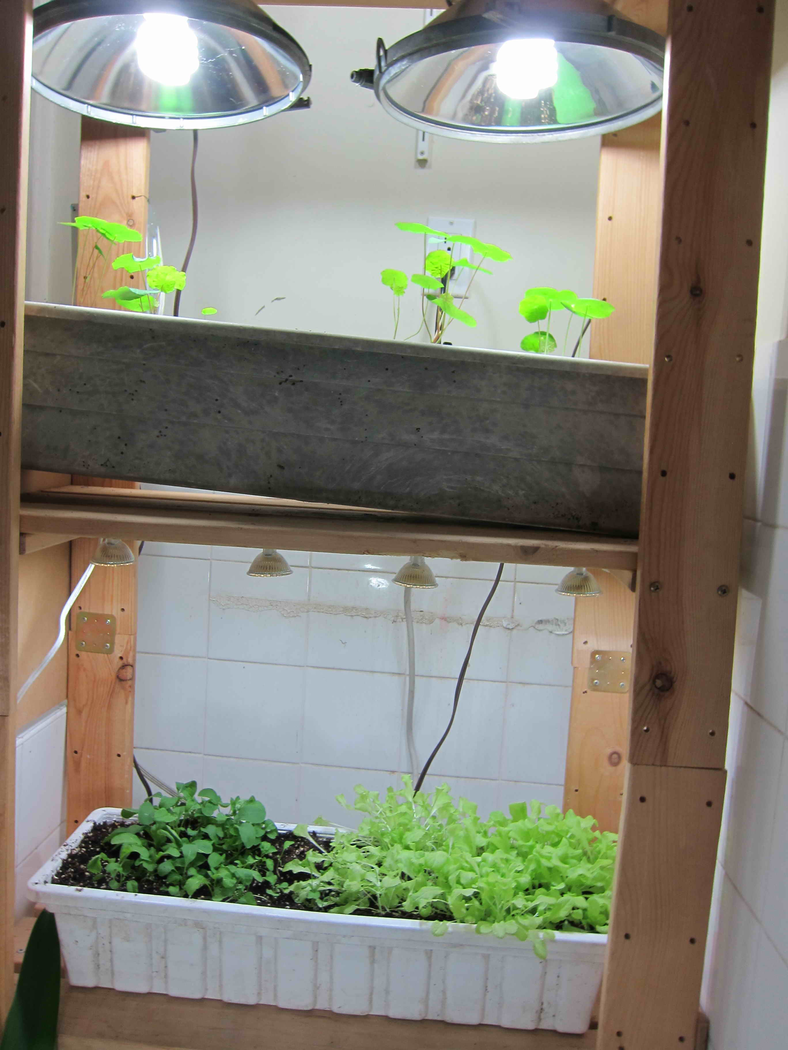 Here at Greenmoxie HQ we have been experimenting with indoor gardens and our indoor laundry farm has recently undergone an upgrade. From its rough and tumble windowsill beginnings: