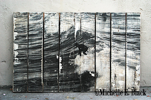 Michelle E. Black takes summer trips to Hermosa Beach with her family where she like to sit and watch the surfers. She recreates a scene (pictured below) from one of her visits on an upcycled shipping pallet which was used to ship dental equipment. This breathtaking piece is one-of-a-kind which you can see on her Etsy shop here. Michelle is an avid photographer and artist who has utilized pallets in many of her works – browse her lovely shop to see other shipping pallet art.