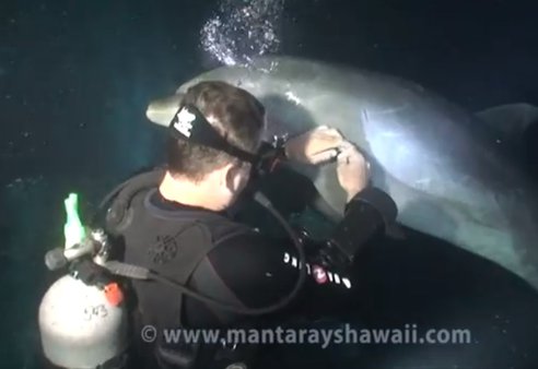 Green living: Keller Laros was out on a night dive with manta rays off the coast of Hawaii when he noticed a dolphin persistently circling. When the wild mammal came right up to the divers, they noticed its pectoral fin was entangled in line and a fishing hook was embedded in it’s flesh. That’s when Laros realized the dolphin was asking for help. The dolphin positioned itself near Laros as he cut the line free and worked the hook out.